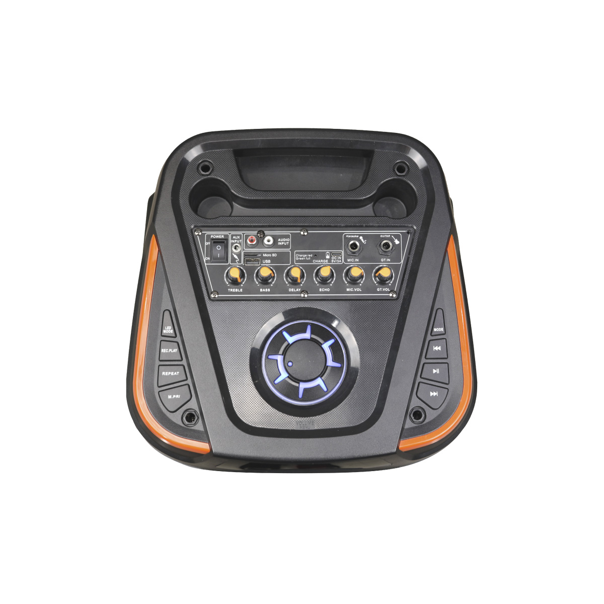 - Rotary Controls for Treble, Bass, Delay, Echo, Mic Volume, Guitar Volume